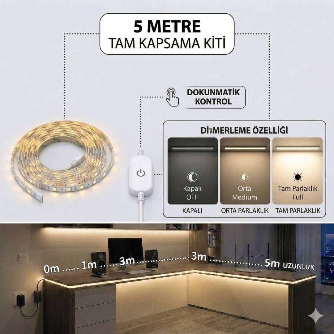 5 Metre Gün ışığı LED Işık Kiti ile evinizin aydınlatmasını bir üst seviyeye taşıyın. Beyaz Işık rengi, yaşam alanlarınıza huzurlu ve davetkar bir atmosfer katarken, dokunmatik dimmer özelliği ile ışık şiddetini her an kontrol etmenize olanak tanır. Yemek yaparken, çalışırken veya dinlenirken ihtiyacınız olan ışığı tek bir dokunuşla ayarlayın.
