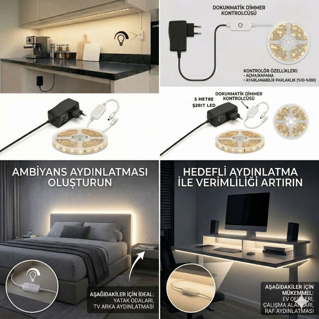 Fonksiyonel ve Estetik Mutfak Aydınlatması Mutfak tezgah altı aydınlatması için ideal olan bu kit, yemek hazırlığı yaparken mükemmel bir görüş alanı sağlar. Dokunmatik dimmer ile parlaklığı ayarlayarak, yemek yaparken tam güçte, akşam yemeği sırasında ise loş bir ambiyans ışığı olarak kullanabilirsiniz. Modern mutfak tasarımlarınıza şıklık ve fonksiyonellik katar.