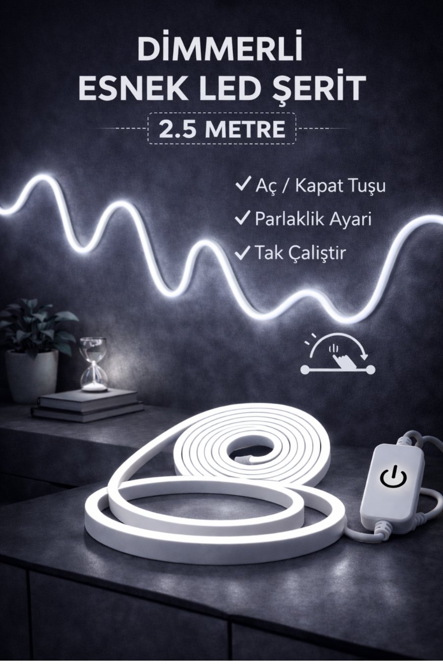 Yaşam alanlarınıza modern ve şık bir dokunuş katın! Dimmerli esnek neon LED şerit, homojen ışık dağılımı ve kolay kullanımı sayesinde ev, ofis ve dekoratif alanlarda mükemmel bir ambiyans oluşturur.
